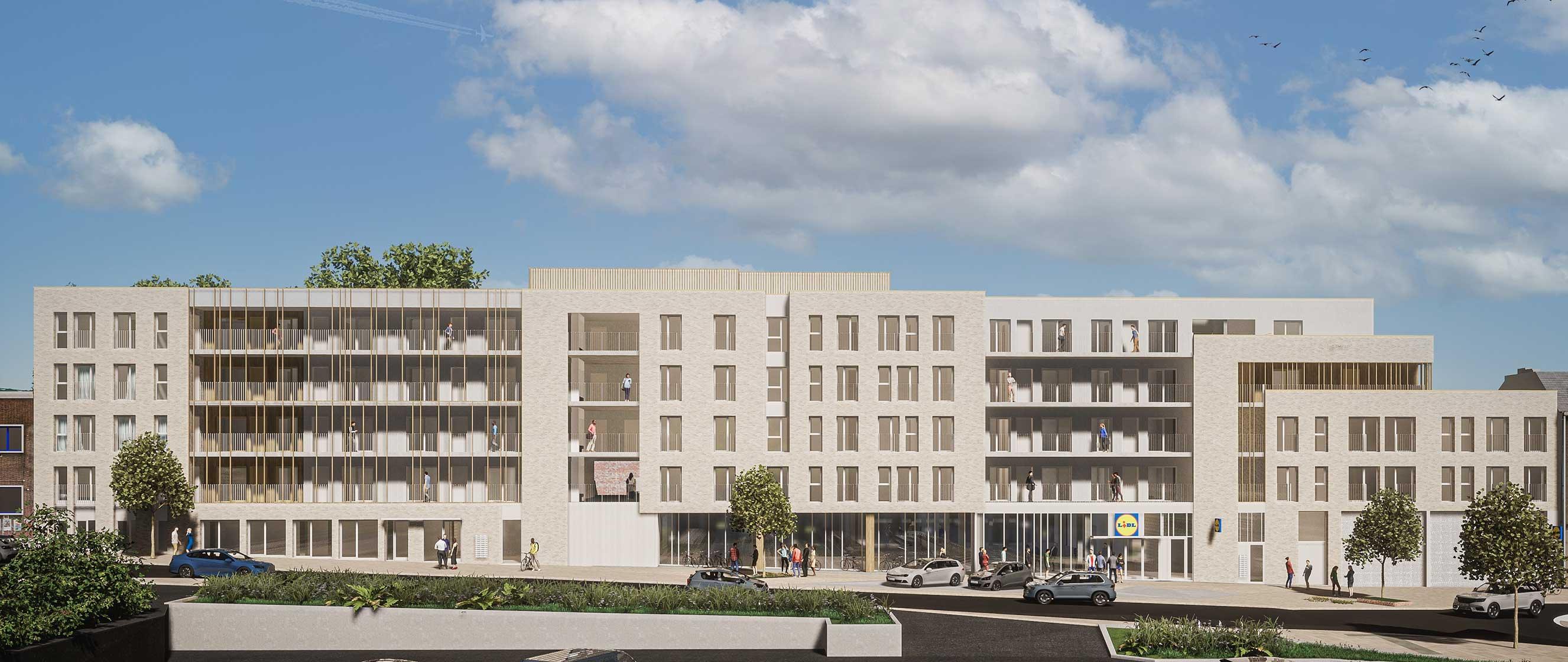 De huidige Brico-winkel wordt vanaf deze maand gesloopt. Daarna volgt de bouw van 49 sociale appartementen, een Lidl-supermarkt (2.287 m² GLA) en een ruimte voor vrije beroepen. In het project zijn ook 126 fietsstelplaatsen en 116 parkeerplaatsen over twee ondergrondse niveaus voorzien.